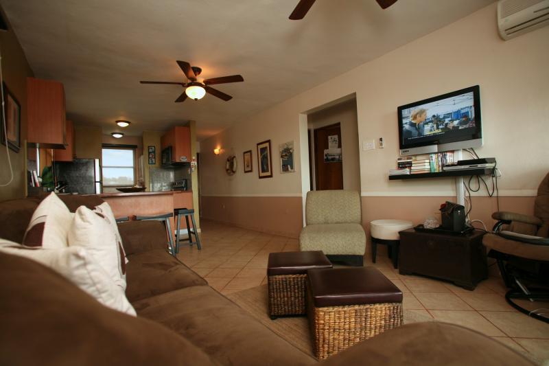 Pelicano 3 at same bldg & location - sleeps 6 Balcony (2) (one from living room and the other at the master bedroom) with sea and pool view - 2 bedrooms: Master with queen size bed and private bathroom, another bathroom in the hall, 2nd bedroom with full size bed and full size futon bed, kitchen & laundry, a/c, ceiling fans, 2 off-street parking, cable tv, internet, Ipod player, beach chairs. Full Kitchen with granite counter top and full laundry Living Room with A/C and ceiling fan rincon pr beach house rentals, rincon pr beach villa rentals, rincon pr beach condo rentals, rincon pr beach apartment rentals, cumpleaños en Rincon, quinceañeros en Rincón PR, estadías en Rincón PR,